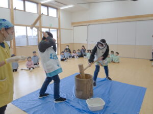 全園児で杵でつきましたし、「よいしょ~」の掛け声とともに楽しいもちつき会となりました。